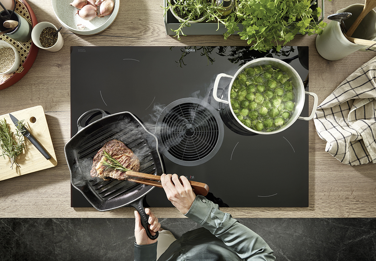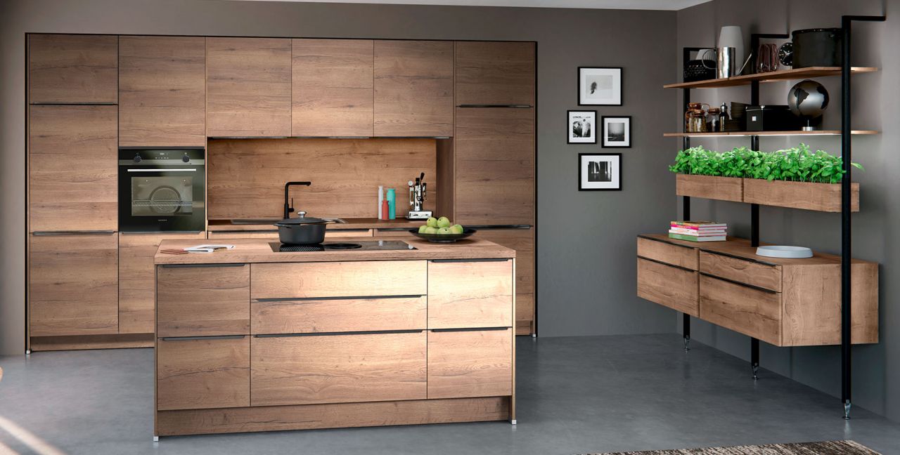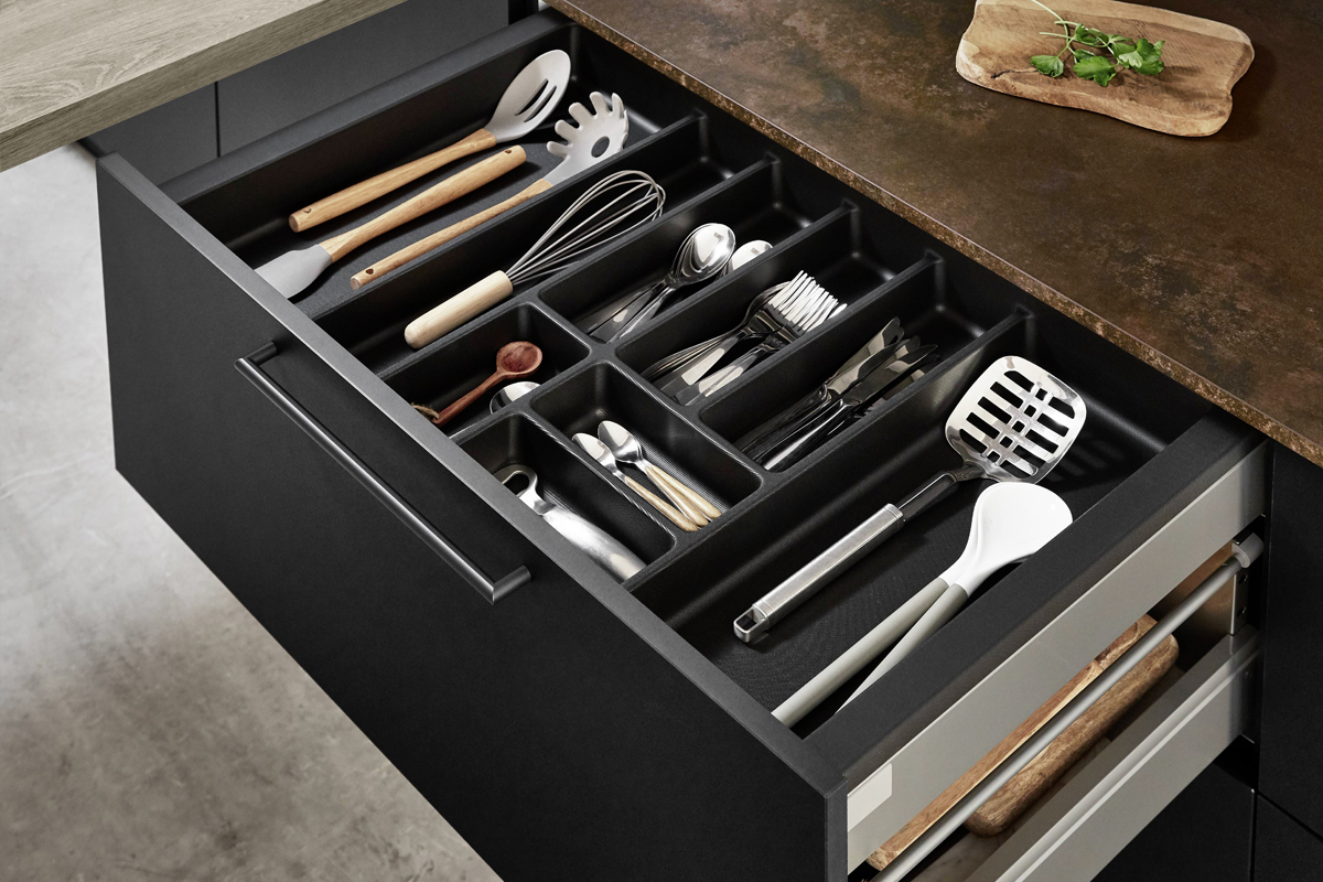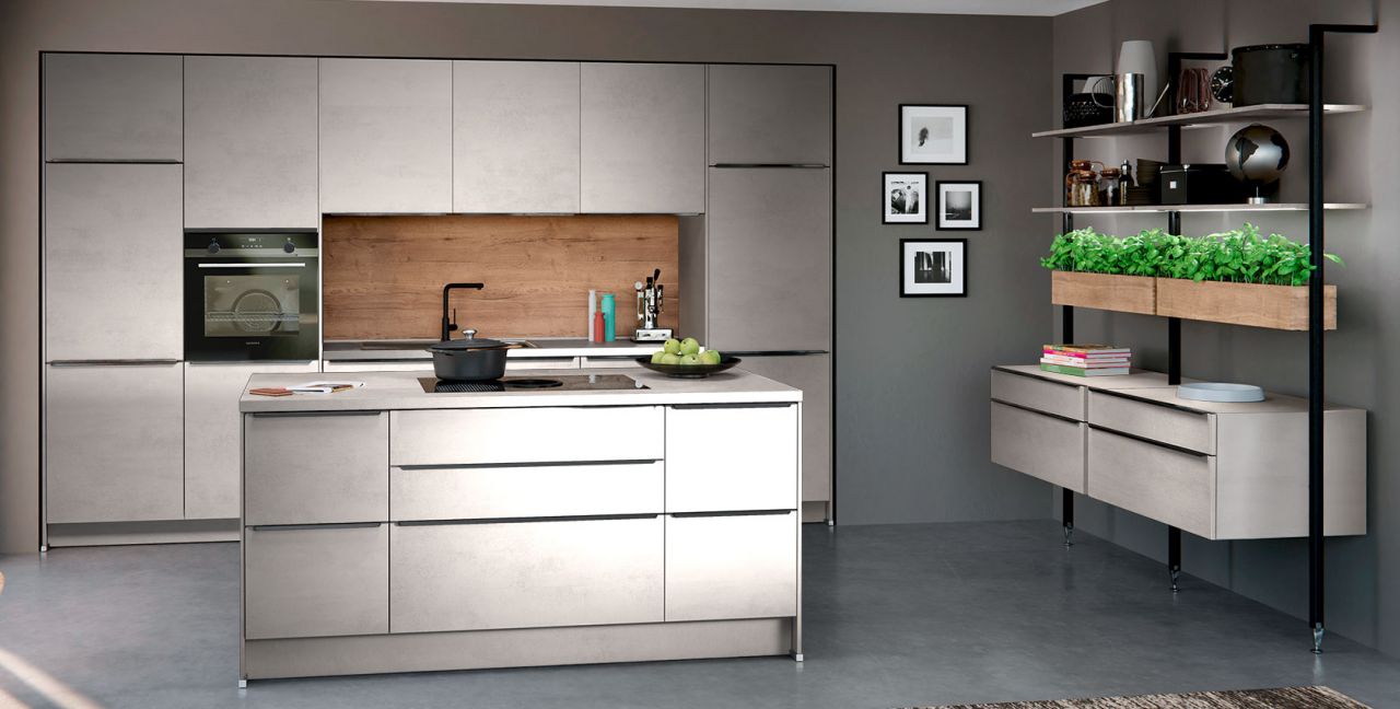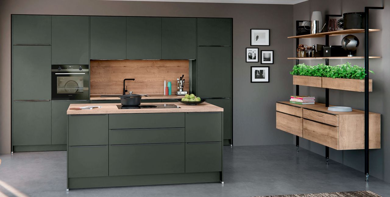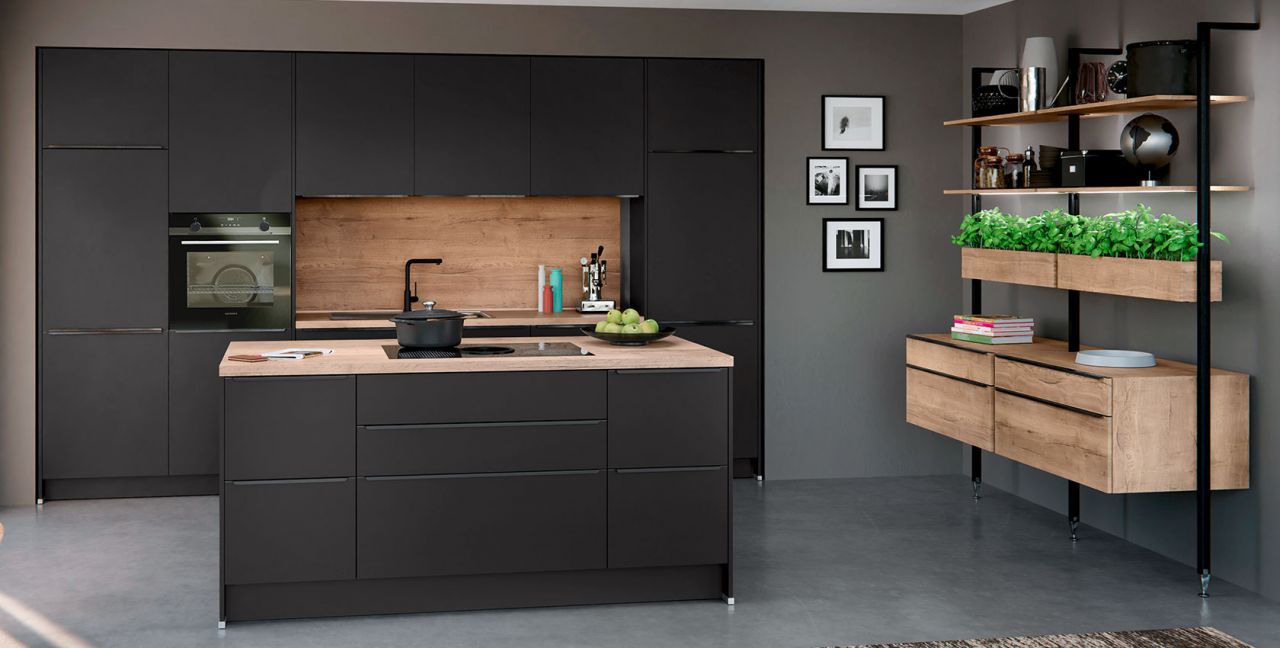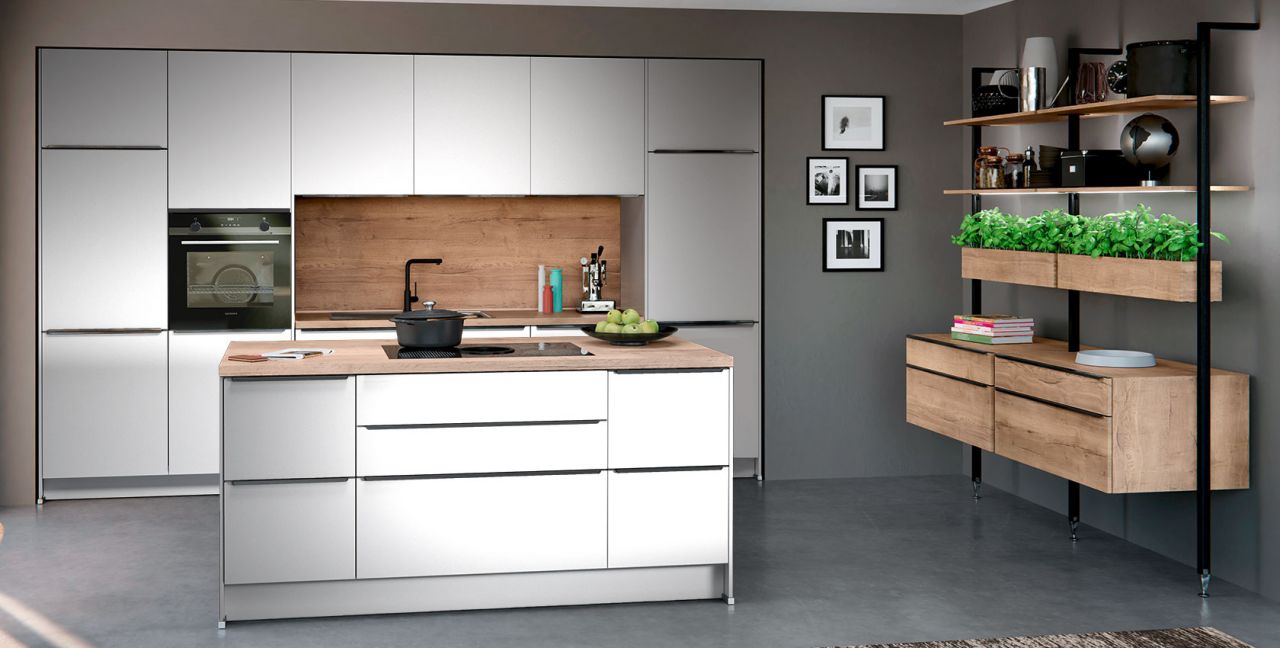 Inclusief RVS-inbouwoven Siemens HB517ABS0 Energieklasse A, keramische kookplaat met inductie en werkbladafzuiging (circulatielucht) Bora GP4U, koelkast Laurus LKG88E Energieklasse E, RVS-inbouwspoelbak Rodi Okio Line 85 Deep, plankenreksysteem, onderkasten met grote laden.