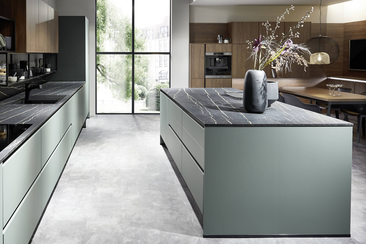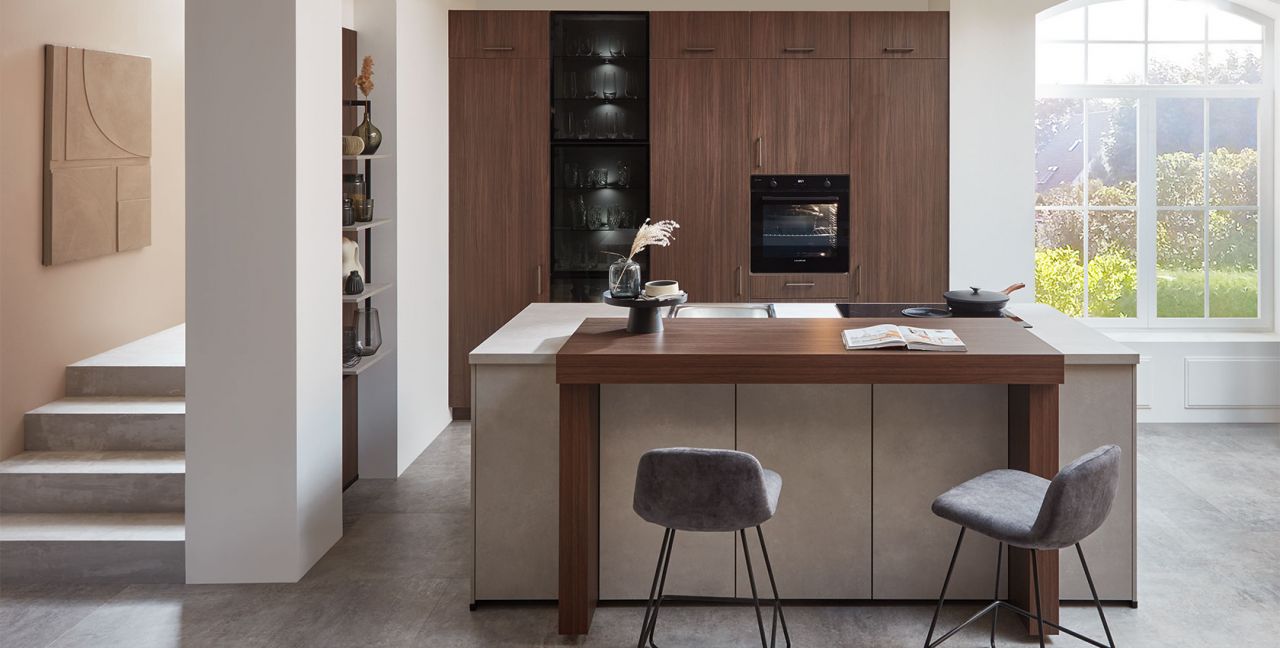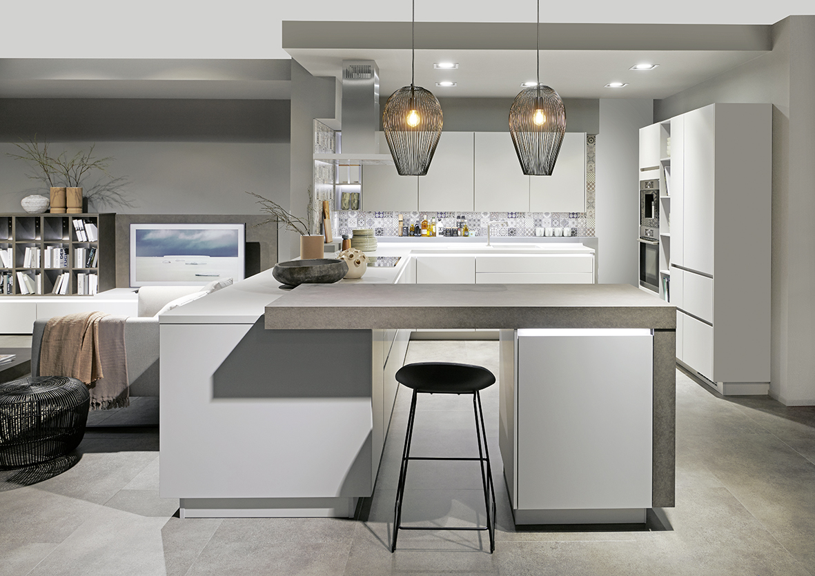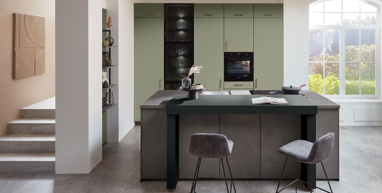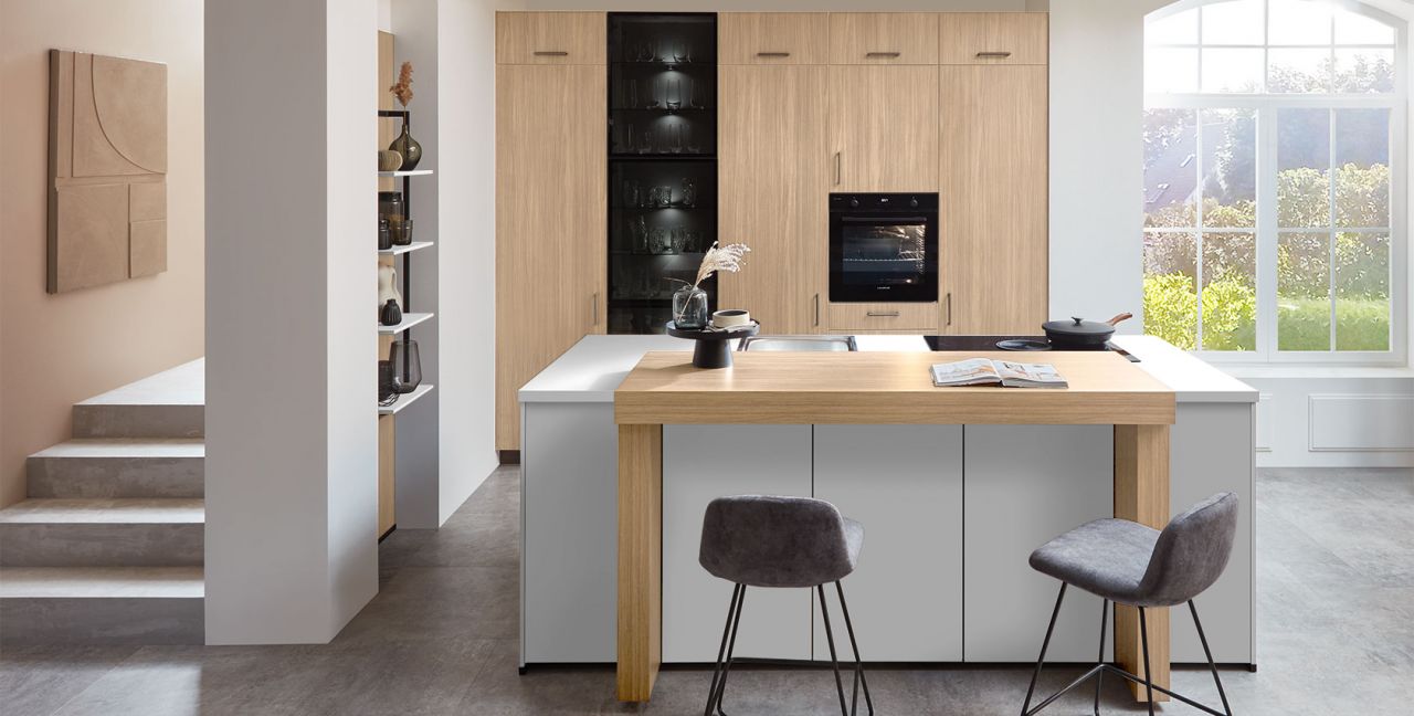 Inclusief inbouwoven Laurus LEB10BK Energieklasse A, keramische kookplaat met inductie en werkbladafzuiging (circulatielucht) Bora GP4U, koelkast Progress PK1816 Energieklasse E, RVS-inbouwspoelbak Rodi NewManaus, XL-kasten, wandkasten met klapdeur, hoge kastplank, eetbar.